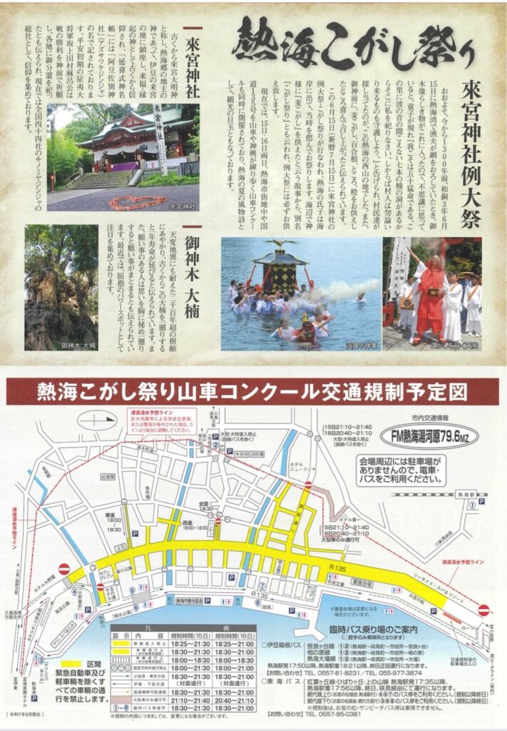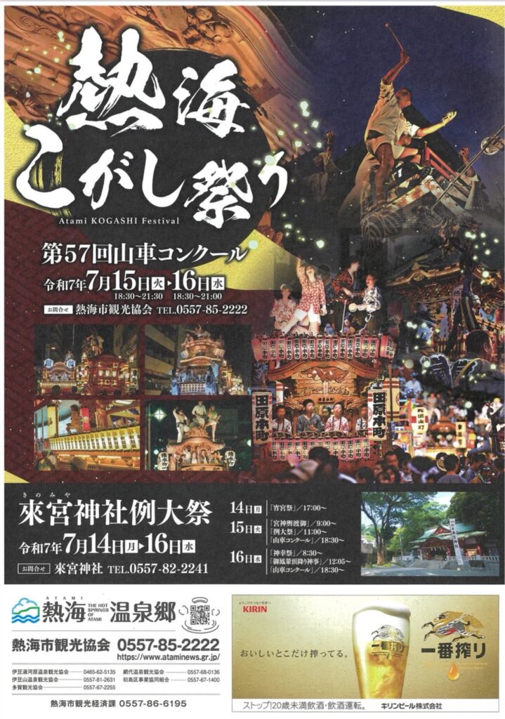 毎年7月中旬、熱海の街に熱気が満ちあふれる3日間──それが來宮神社例大祭です。伝統あるこのお祭りは、7月14日の「宵宮祭」から始まり、15日・16日には神事、神輿、山車が町を彩り、多くの観光客と市民で賑わいます。