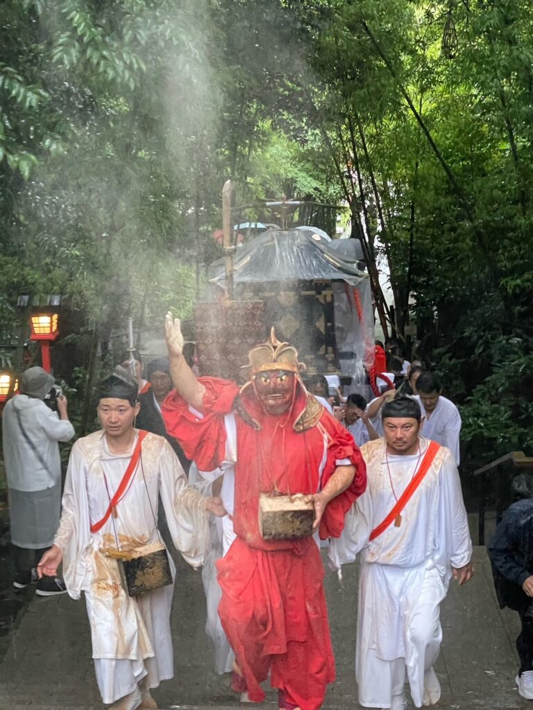 御神幸行列では、猿田彦が「麦こがし」を撒きながら道案内。麦こがしに触れると無病息災・身体健康のご利益があると言われています。