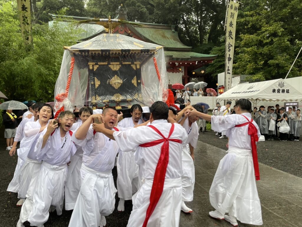 神々を御鳳輦(ごほうれん)に乗せ、42歳の厄年を迎えた男性たちが力強く担ぎ上げ、町中を練り歩きます。その姿はまさに圧巻。