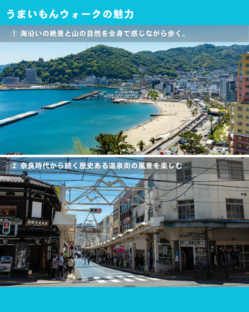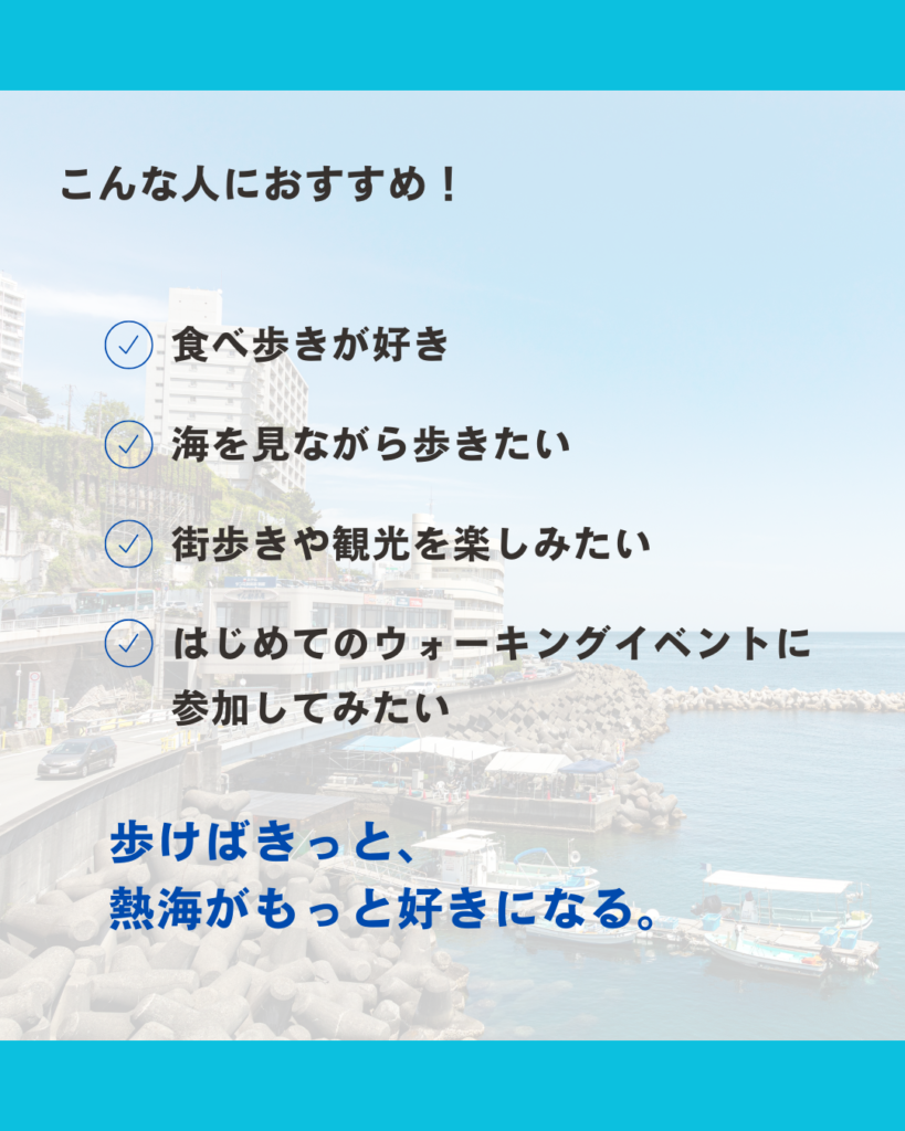 本イベントは、美しい海岸線や温泉街の風情ある町並み、緑豊かな自然を楽しみながら、約10kmのコースをウォーキングするイベントです。途中では、熱海ならではの地元食材を活かした“うまいもん”を味わうことができ、観光とはひと味違った地域体験をお楽しみいただけます。